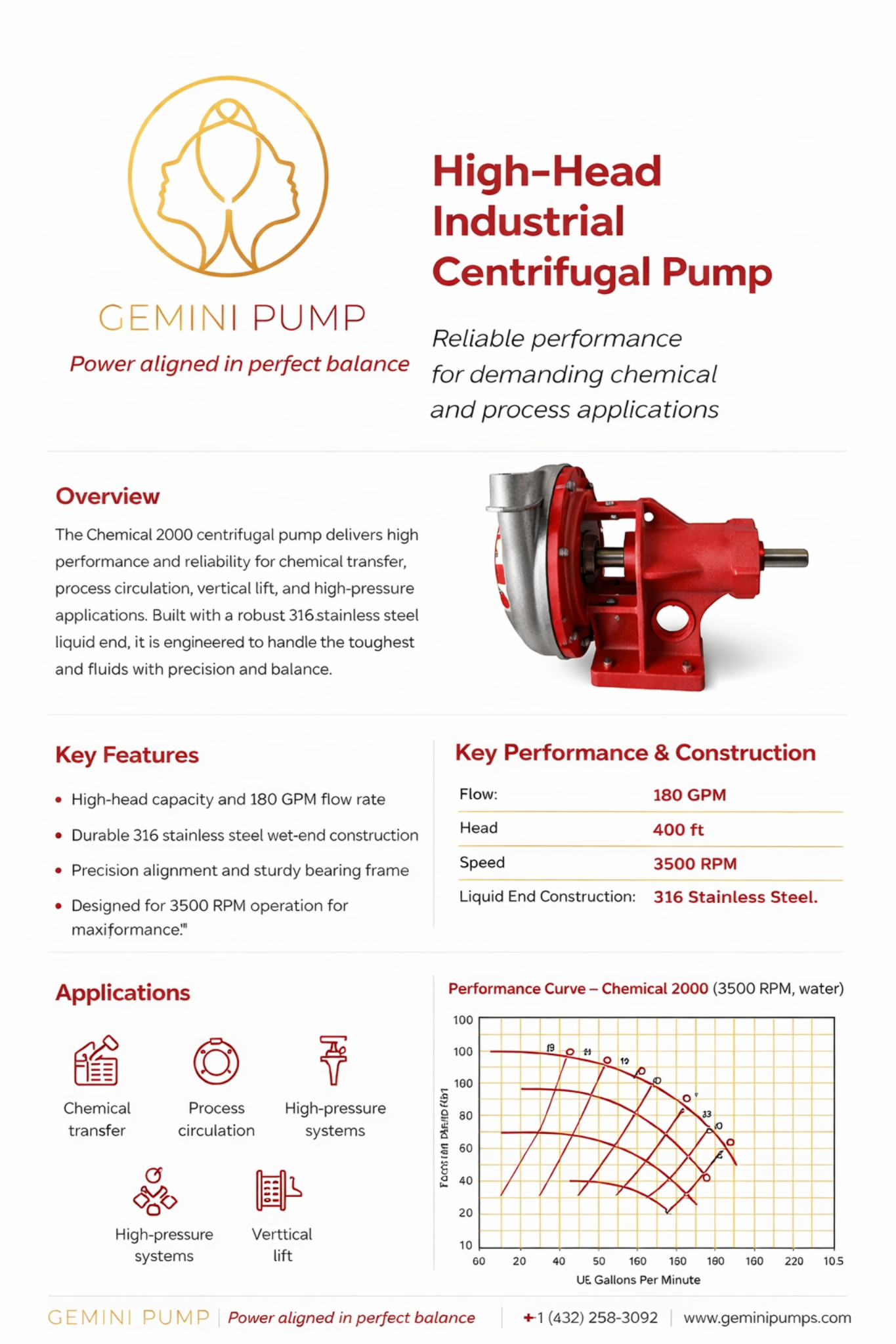 Engineered for demanding petrochemical service, the Chemical 2000 delivers high-head capability for process circulation, hydrocarbon transfer, and vertical lift systems. With a 316 stainless steel liquid end and precision alignment, this pump is built for continuous-duty performance in refinery and chemical facilities.