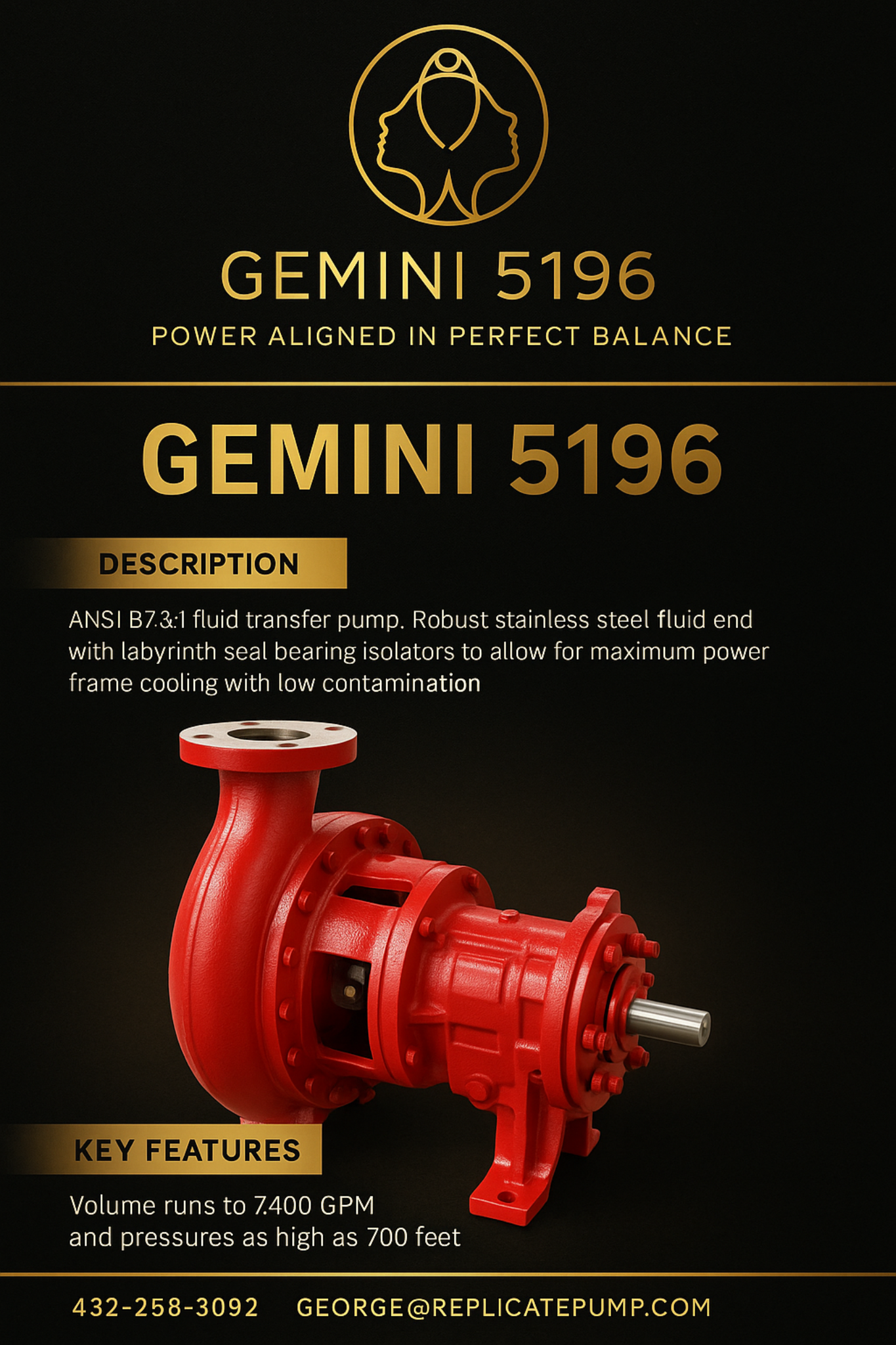 The Gemini 5196 ANSI B73.1 process pump is designed for crude oil, refined fuels, aromatics, and petrochemical fluid handling. Featuring robust stainless steel fluid ends and labyrinth seal bearing isolators, it ensures maximum cooling efficiency and reduced contamination risk in high-performance environments.